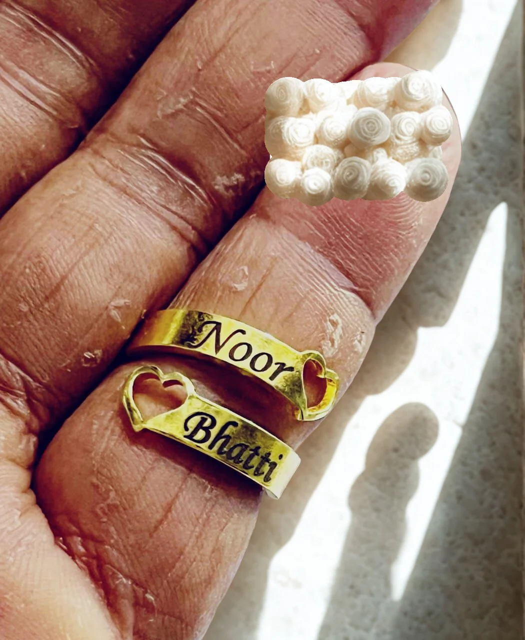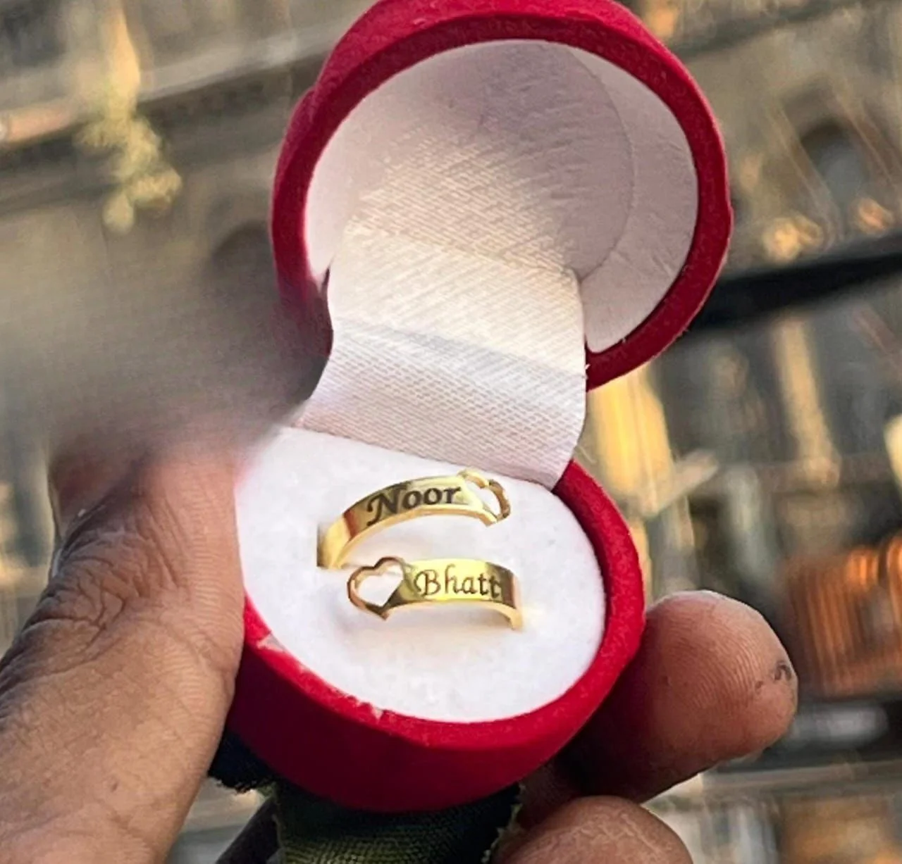 Personalized Heart Double Name Ring in golden brass. Durable, stylish & perfect for couples. Ready for hand-to-hand delivery with gift box.